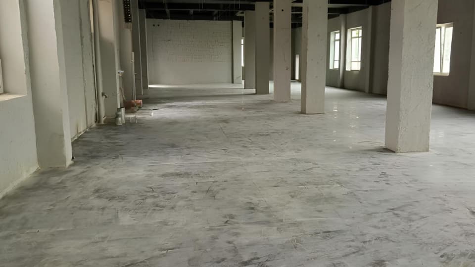 Была подобрана конструкция: топпинговый пол средней толщиной 11 см с армированием пластиковой фиброй и дополнительным каркасным армированием в зонах со слабым основанием.