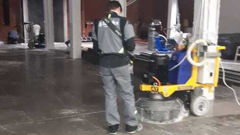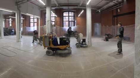 Заказчик – арендатор офиса – видел решение проблем в том, чтобы занового перекрасить поверхность и таким образом сделать его более «свежим». Наш главный инженер, используя весь свой опыт, прекрасно понимал, что предложенный вариант не очень-то работающий, потому что «вышелушивание» всё равно продолжится. Основа для покрытия – бетон с упрочнителем, а он не впитывает в себя и поэтому не способствует хорошему приклеиванию полимерных материалов. Поэтому искали другое решение, которое подошло бы для стиля лофт и при этом выглядело бы эстетично и обладало бы высокими эксплутационными свойствами. На весь этот комплекс запросов мы нашли решение – технологию под названием «полированный бетон». Представляет она из себя следующее: старое основание шлифуется, далее в него вносится жидкий упрочнитель и в конце полируется. Покрытие приобретает гладкий и зеркальный вид, открываются поры бетона, рисунок бетона. У пола появляется своего рода мозаичный облик. Финишный вид такого покрытия – глянцевый и зеркальный, а вот клиент как раз хотел избежать этого, потому что отблески, переливы отвлекают внимание сотрудников. Нам пришлось искать решение, чтобы удовлетворить и эту потребность – полированный, но неблестящий бетон.