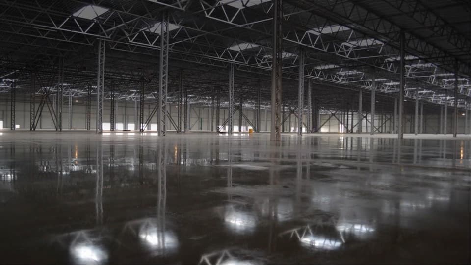 Клиент строил логистический центр площадью 200 000 м2. и искал тех, кто способен выполнить бесшовную плиту и гарантировать отсутствие трещин в будущем. На момент обращения в компанию «Профтехпол» предыдущий подрядчик уже сделал 40 000 м2 полов, потрескавшиеся в течение нескольких месяцев. Поэтому заказчик сделал выбор в пользу нашей компании. Задача звучала следующим образом: выполнить сталефибробетонный пол с упрочнителем без нарезки усадочных швов – так называемый бесшовный пол – с требованием по ровности 1 мм на 1 метр; ежедневно заливать и обрабатывать топпингом площадь 1 500 м2.