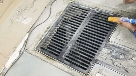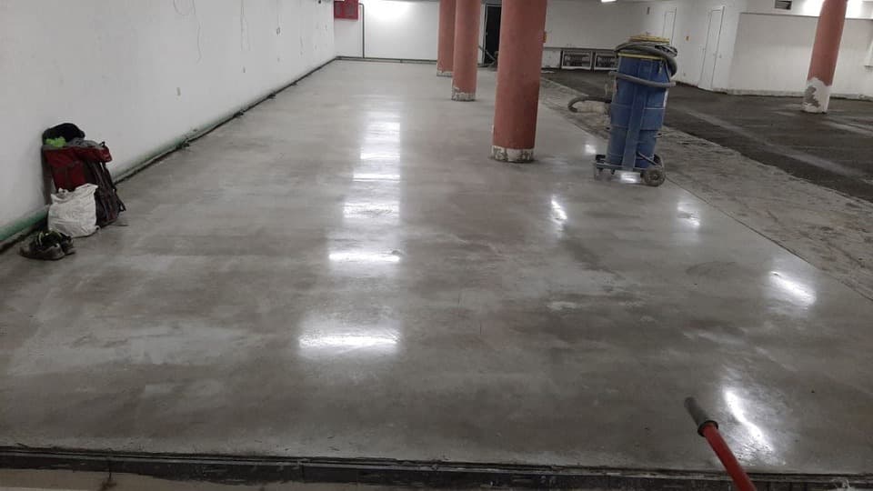 Особенность работ состояла в том, что стояли ливневые лотки нестандартного варианта, т.е. сделанный пол примыкал к самой решётке лотка, хотя по плану решётка должна вставляться в углубление. На этом моменте не было акцентировано внимание. Пришлось отрезать и снять пол вдоль лотка на ширину 7 см, сделать пропил рядом с лотком и вставить металлическую пластину на эпоксид.