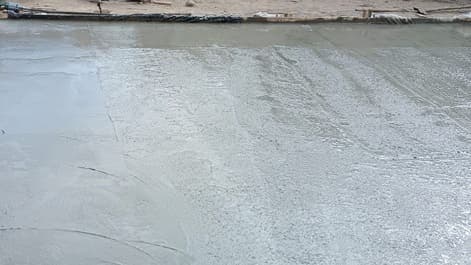 На открытой площадке – без стен и крыши – требовалось сделать бетонный пол. Её общая площадь составляла около 1 600 м2, но нам досталось только 860 м2. Получилось так вот по какой причине: изначально заказчик обратился за услугой в другую компанию, которая залила половину площади, но без топпинга. А клиент к этому моменту узнал про топпинг и поэтому пригласил уже нас.
