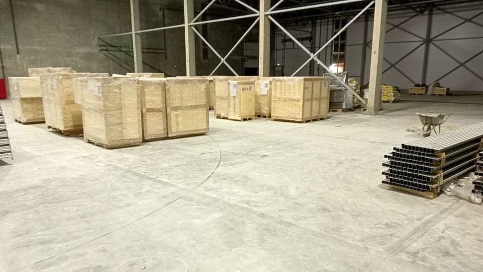 Конструкция была подобрана в соответствии с проектом заказчика — упрочнённый бетонный пол средней толщиной 180 мм с двойным слоем арматурного каркаса.